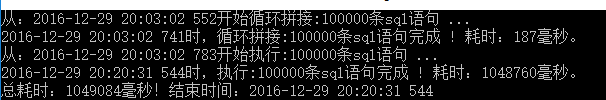 Console.WriteLine(DateTime.Now.ToString("yyyy-MM-dd HH:mm:ss fff") + "時(shí),循環(huán)拼接:" + cnt + "條sql語(yǔ)句完成 ! 耗時(shí):" + result + "毫秒。");