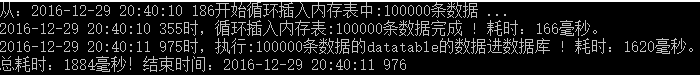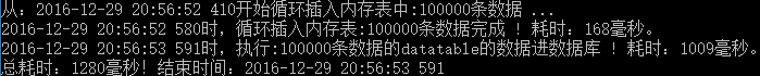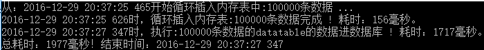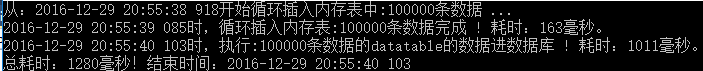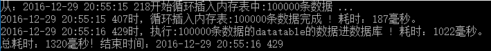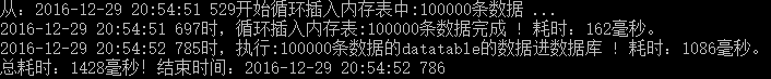 Console.WriteLine(DateTime.Now.ToString("yyyy-MM-dd HH:mm:ss fff") + "時(shí),循環(huán)插入內(nèi)存表:" + cnt + "條數(shù)據(jù)完成 ! 耗時(shí):" + sw.ElapsedMilliseconds + "毫秒。");