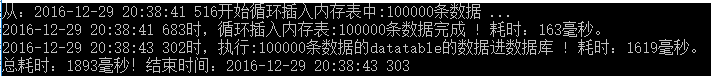 Console.WriteLine("從:" + DateTime.Now.ToString("yyyy-MM-dd HH:mm:ss fff") + "開(kāi)始循環(huán)插入內(nèi)存表中:" + cnt + "條數(shù)據(jù) ...");