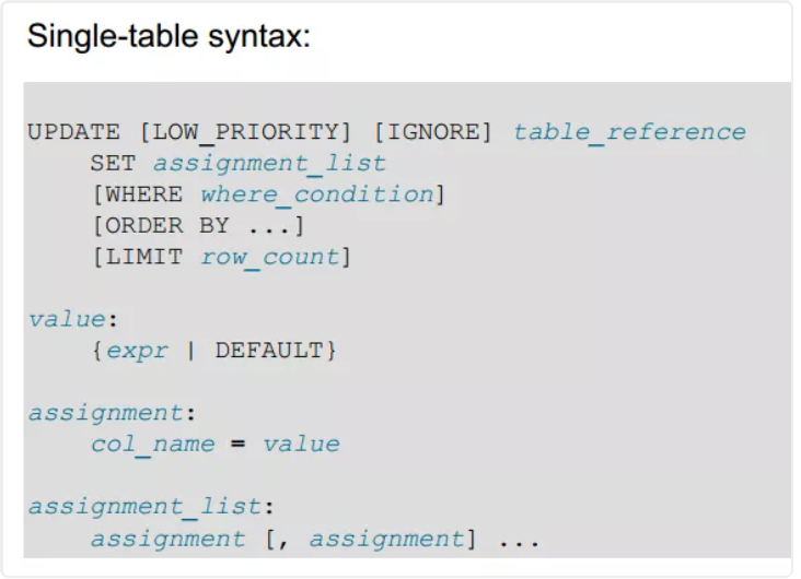 看起來,語法是完全沒有問題,翻了翻 MySQL 官方文檔的 update 語法: