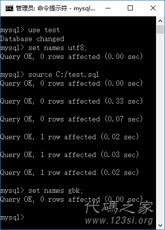 mysql> use test Database changed mysql> set names utf8; Query OK, 0 rows affected (0.00 sec) mysql> source C:/test.sql Query OK, 0 rows affected (0.00 sec) Query OK, 0 rows affected (0.33 sec) Query OK, 0 rows affected (0.07 sec) Query OK, 1 row affected (0.02 sec) Query OK, 1 row affected (0.03 sec) Query OK, 1 row affected (0.02 sec) mysql> set names gbk; Query OK, 0 rows affected (0.00 sec)