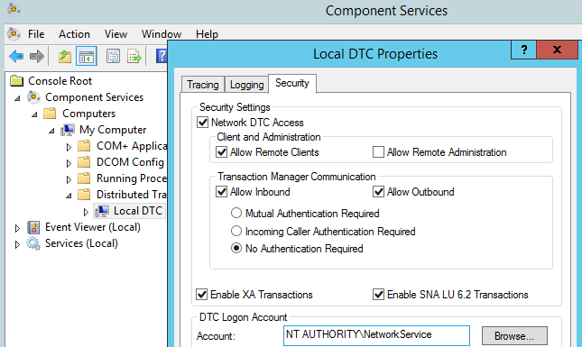 (2)在服務(wù)器管理工具Administrative Tools中找到Component Services,在Local DTC中屬性Security選項(xiàng)卡中配置如下,打開相關(guān)安全設(shè)置,完成后會重啟服務(wù),也有文檔稱需要重啟服務(wù)器,但是至少2012 R2不用。