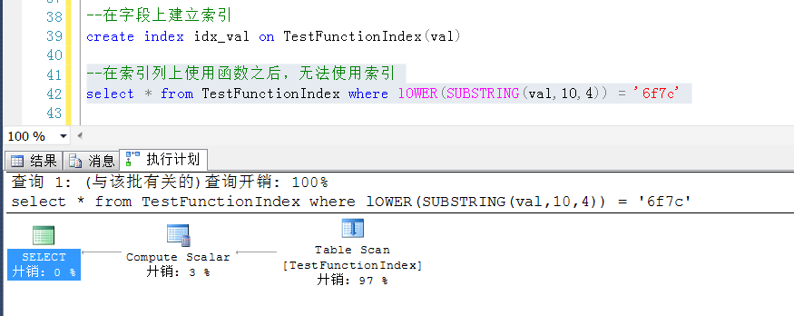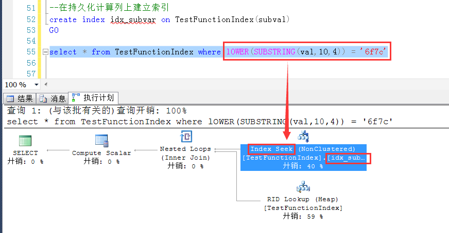 Create Table TestFunctionIndex ( id int identity(1,1), val varchar(50), subval as LOWER(SUBSTRING(val,10,4)) persisted --增加一個(gè)持久化計(jì)算列 ) GO --在持久化計(jì)算列上建立索引 create index idx_subvar on TestFunctionIndex(subval) GO --插入10W行測(cè)試數(shù)據(jù) insert into TestFunctionIndex(val) values (NEWID()) go 100000