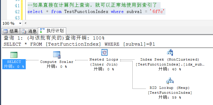 測(cè)試中神奇地發(fā)現(xiàn),如果計(jì)算列字段上建立了索引,在原始字段上使用函數(shù)與計(jì)算列的函數(shù)一樣的時(shí)候,可以神奇地使用到計(jì)算列上的索引??梢奡QLServer在我們沒有注意的地方也是下了不少功夫的啊