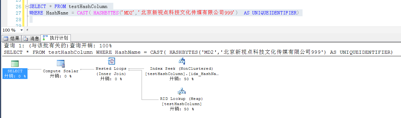 參考如下查詢,就可以使用HashName計(jì)算出來的值與計(jì)算列做比較,在一定程度上可以減少檢索字段索引的大小,又能達(dá)到目的的效果