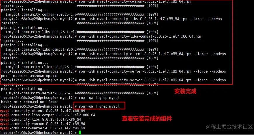 // mysql-community-common 1、rpm -ivh mysql-community-common-8.0.16-2.el7.x86_64.rpm // mysql-community-libs 2、rpm -ivh mysql-community-libs-8.0.16-2.el7.x86_64.rpm --force --nodeps // mysql-community-libs-compat 3、rpm -ivh mysql-community-libs-compat-8.0.16-2.el7.x86_64.rpm // mysql-community-client 4、rpm -ivh mysql-community-client-8.0.16-2.el7.x86_64.rpm --force --nodeps // mysql-community-server 5、rpm -ivh mysql-community-server-8.0.16-2.el7.x86_64.rpm --force --nodeps // 查看已安裝的組件 6、rpm -qa | grep mysql