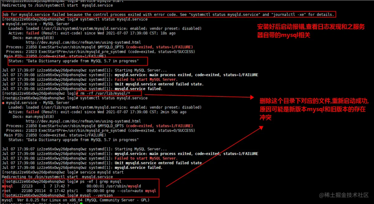 說明是因為新版本和之前服務(wù)器自帶的版本對應(yīng)的包存在沖突,刪除對應(yīng)的沖突目錄即可,執(zhí)行: rm -rf /var/lib/mysql/*(執(zhí)行刪除命令的時候要看清楚哦)