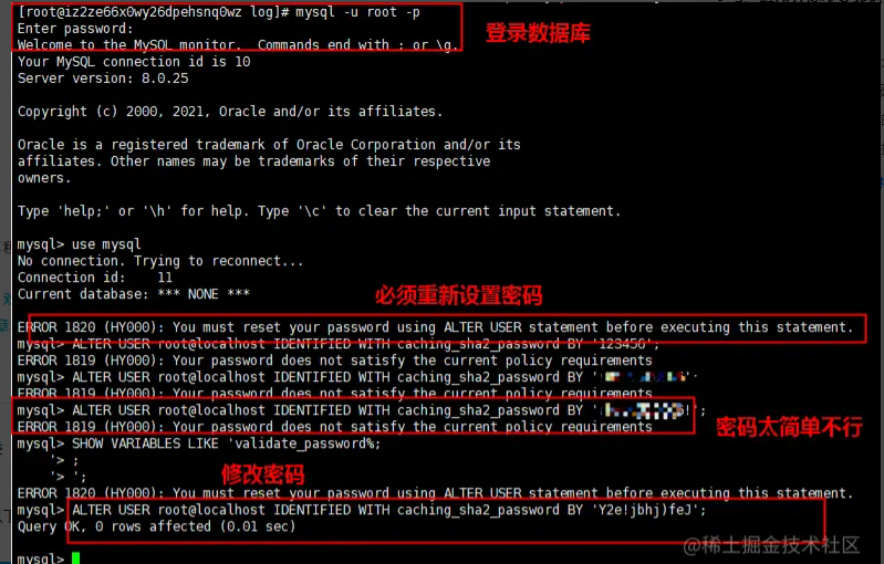 mysql -u root -p回車,然后輸出密碼 - 第一次連接會強制你必須修改連接密碼,可以使用以下的語句進(jìn)行修改密碼: