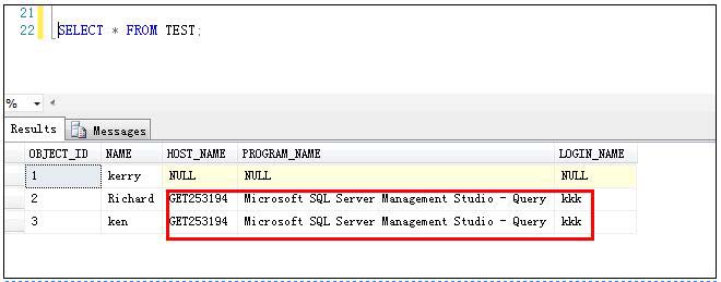 那么我們接下來在表上面新增幾個字段 [HOST_NAME]、[PROGRAM_NAME]、LOGIN_NAME用來記錄最后一次修改該記錄的會話信息,另外創(chuàng)建觸發(fā)器TRG_TEST來更新這幾個字段