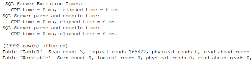 執(zhí)行計(jì)劃看起來(lái)非??植溃ú樵儍?yōu)化器甚至啟用了并行計(jì)劃!),因?yàn)闀灢檎疫\(yùn)算符這里執(zhí)行了80000次,查詢本身產(chǎn)生了超過(guò)165000個(gè)邏輯讀?。ㄟ壿嬜x個(gè)數(shù)可以從STATISTIC IO里獲?。?。