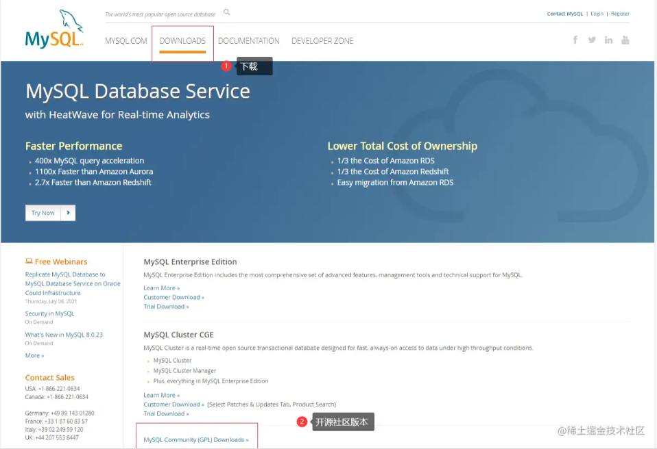(1)進(jìn)入MySQL官網(wǎng) =》選擇“DOWNLOADS”選項(xiàng) =》 點(diǎn)擊MySQL Community (GPL) Downloads »