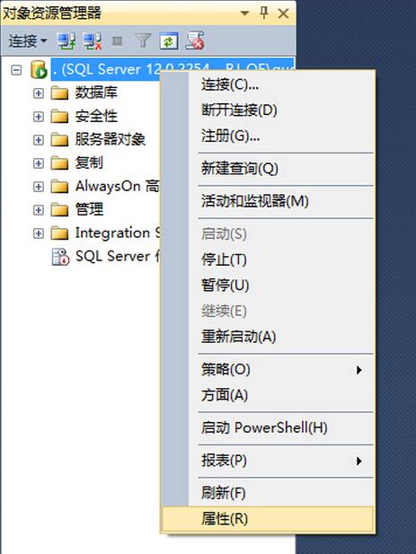 STEP1. 打開(kāi)SSMS,使用Windows身份連接數(shù)據(jù)庫(kù),登錄后,右鍵選擇“屬性”