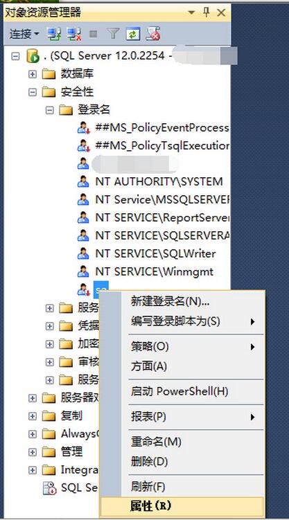 STEP 4. 展開(kāi)“安全性” -》登錄名 -》sa,右鍵選擇“屬性”