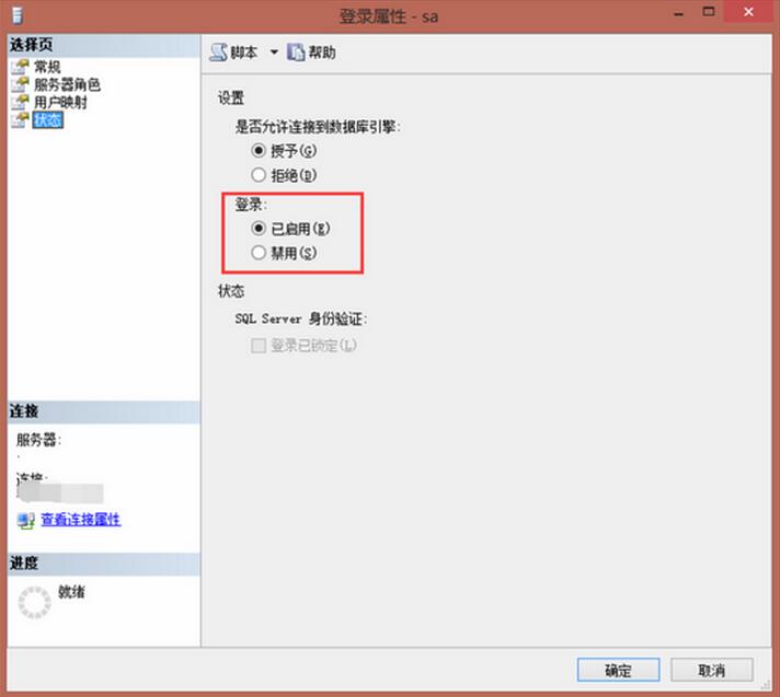 STEP 6. 在“狀態(tài)”中,啟用sa登錄,點(diǎn)擊“確定”按鈕