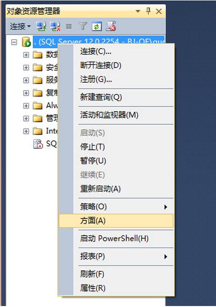 STEP 7. 右鍵數(shù)據(jù)庫(kù)server,選擇“方面”