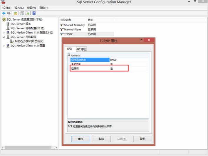 STEP 10. 配置SSCM,選中左側(cè)的“SQL SERVER服務(wù)”,確保右側(cè)的“SQL SERVER”以及“SQL SERVER BROWER”正在運(yùn)行,選擇“網(wǎng)絡(luò)配置”,雙擊TCP/IP,確保狀態(tài)為“啟用”