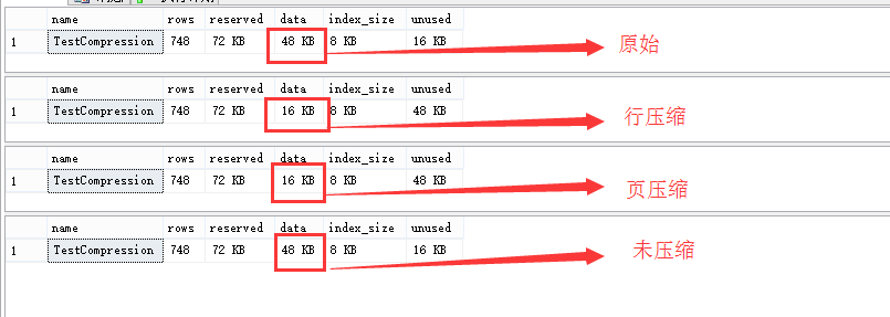 -- 原始值 EXEC sp_spaceused TestCompression GO -- DATA_COMPRESSION = 設(shè)置行壓縮 ALTER TABLE TestCompression REBUILD WITH (DATA_COMPRESSION = ROW); GO EXEC sp_spaceused TestCompression GO -- DATA_COMPRESSION = 設(shè)置頁壓縮 ALTER TABLE TestCompression REBUILD WITH (DATA_COMPRESSION = PAGE); GO EXEC sp_spaceused TestCompression GO -- DATA_COMPRESSION = 沒有壓縮 ALTER TABLE TestCompression REBUILD WITH (DATA_COMPRESSION = NONE); GO EXEC sp_spaceused TestCompression GO
