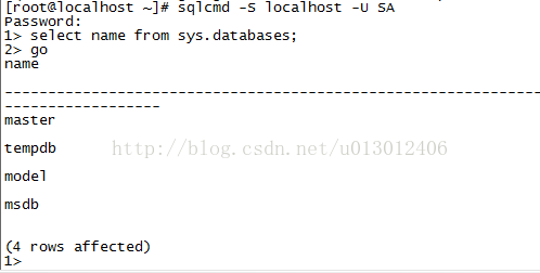 [root@localhost bin]# sqlcmd -S localhost -U SA -P