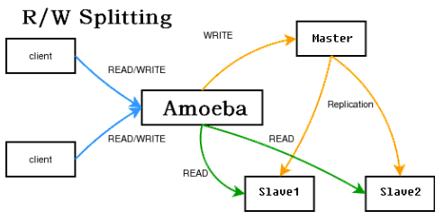 要實現(xiàn)這種方式,需要程序特別設(shè)計,寫都操作master,讀都操作slave,給程序開發(fā)帶來了額外負(fù)擔(dān)。當(dāng)然目前已經(jīng)有中間件來實現(xiàn)這個代理,對程 序來讀寫哪些數(shù)據(jù)庫是透明的。官方有個mysql-proxy,但是還是alpha版本的。新浪有個amobe for mysql,也可達(dá)到這個目的,結(jié)構(gòu)如下