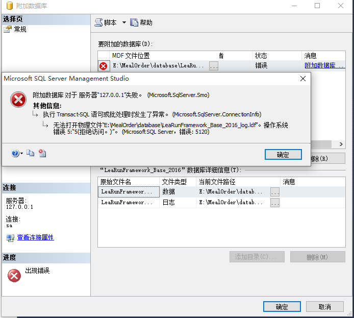附加數(shù)據(jù)時(shí),提示無(wú)法打開(kāi)物理文件,操作系統(tǒng)錯(cuò)誤5。如下圖: