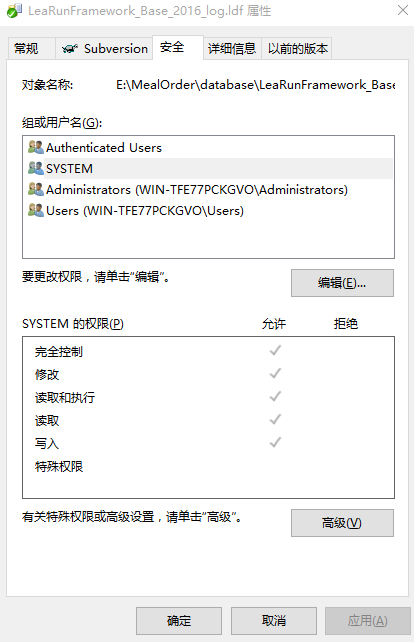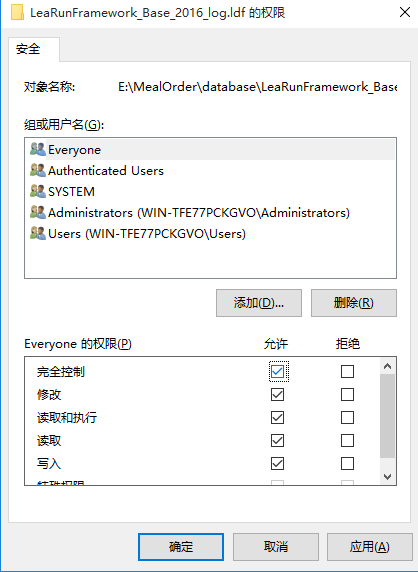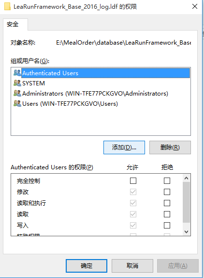 解決方案:找到數(shù)據(jù)庫(kù)的mdf和ldf文件,賦予權(quán)限即可。如下圖: