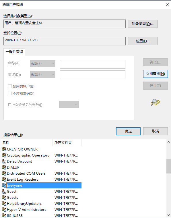 4.高級(jí)-->立即查找-->搜索結(jié)果中找到-->Everyone-->確定-->確定
