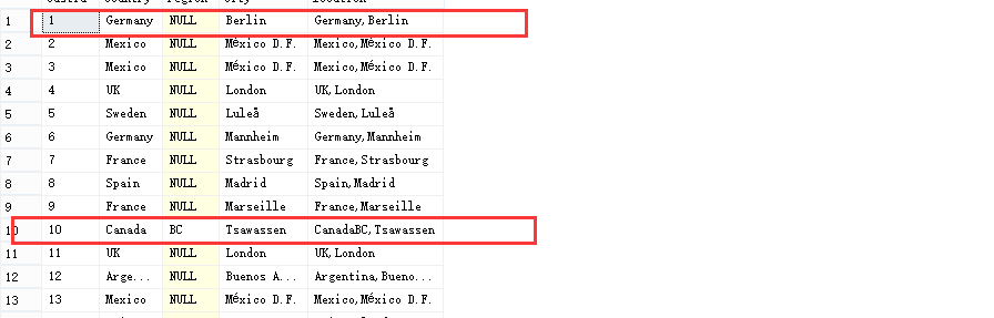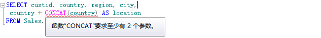 USE TSQL2012 GO SELECT custid, country, region, city, country + CONCAT(country,N''+ region, N',' + city) AS location FROM Sales.Customers