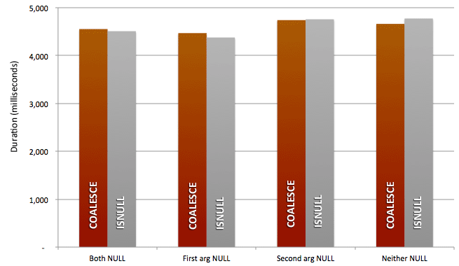 DBCC DROPCLEANBUFFERS; DECLARE @a VARCHAR(5), -- = 'str_a', -- this line changed per test @b VARCHAR(5), -- = 'str_b', -- this line changed per test @v VARCHAR(5), @x INT = 0, @time DATETIME2(7) = SYSDATETIME(); WHILE @x <= 500000 BEGIN SET @v = COALESCE(@a, @b); --COALESCE SET @x += 1; END SELECT DATEDIFF(MILLISECOND, @time, SYSDATETIME()); GO DBCC DROPCLEANBUFFERS; DECLARE @a VARCHAR(5), -- = 'str_a', -- this line changed per test @b VARCHAR(5), -- = 'str_b', -- this line changed per test @v VARCHAR(5), @x INT = 0, @time DATETIME2(7) = SYSDATETIME(); WHILE @x <= 500000 BEGIN SET @v = ISNULL(@a, @b); --ISNULL SET @x += 1; END SELECT DATEDIFF(MILLISECOND, @time, SYSDATETIME());