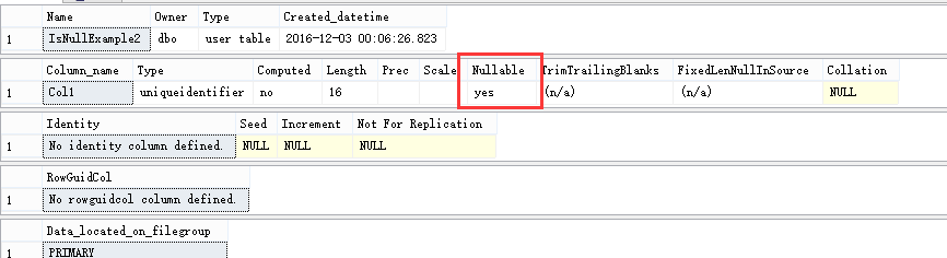 SELECT ISNULL(NEWID(), 'JeffckyWang') AS Col1 INTO dbo.IsNullExample2; EXEC sp_help 'dbo.IsNullExample2';