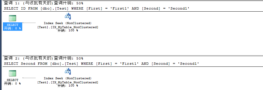 通過上述毫無疑問我們可以得出結(jié)論:查詢1是利用的全表掃描,而查詢2利用的非聚集索引查找。我們應(yīng)該對于這個結(jié)論沒有任何懷疑,因為要第二個查詢的Second列在此之前已經(jīng)創(chuàng)建額非聚集索引,而對于查詢1中的ID則沒有,所以會造成查詢1的全表掃描,而查詢2則是非聚集索引查找。