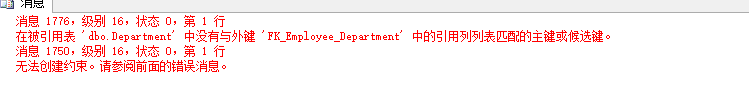現(xiàn)在我們知道外鍵可不是隨便就能建立的,為什么會出現(xiàn)我們引用部門表并將其雇員表中部門Id作為外鍵約束的錯誤呢?通過上述錯誤我們知道在引用表即部門表中沒有其匹配的主鍵或候選鍵,這是指的什么,它的意思是引用表中的外鍵必須是被引用表中的完整主鍵,而不是作為被引用表的一部分,說的更加明確一點則是被引用表即部門表中的部門Id應(yīng)該是主鍵,在這里我們未對部門表中部門Id進行主鍵約束而導(dǎo)致如上錯誤。我們添加主鍵約束即可