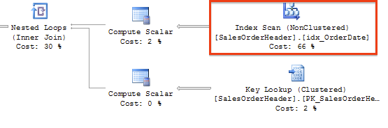 -- Results in an Index Scan SELECT * FROM Sales.SalesOrderHeader WHERE YEAR(OrderDate) = 2005 AND MONTH(OrderDate) = 7 GO