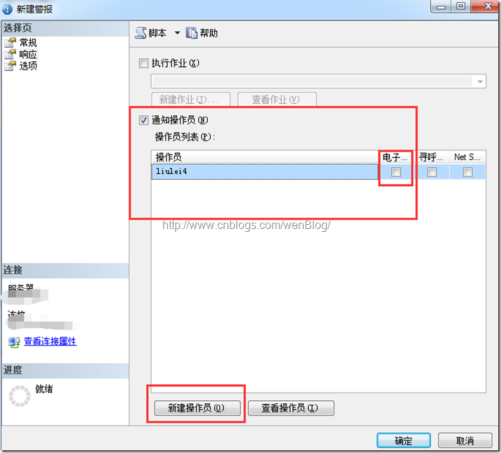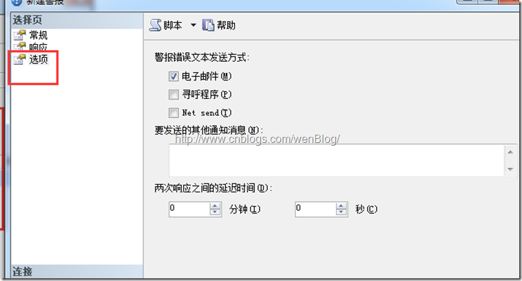 如下圖所示,可以設(shè)定警報錯誤發(fā)送的方式,可以選擇[E-mail]、[Pager]、[Net send]復選框(可多選),同時可以填寫在發(fā)送警報的同時給出的通知消息,并能夠?qū)憫?yīng)的間隔時間進行設(shè)定。