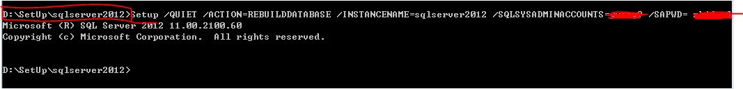 D:\SetUp\sqlserver2012>Setup /QUIET /ACTION=REBUILDDATABASE /INSTANCENAME=sqlserver2012 /SQLSYSADMINACCOUNTS=UserName /SAPWD= ***