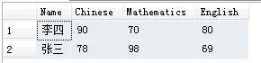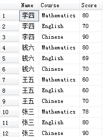 SELECT Name , SUM(CASE WHEN Course = N'語文' THEN Grade ELSE 0 END) AS Chinese , SUM(CASE WHEN Course = N'數(shù)學(xué)' THEN Grade ELSE 0 END) AS Mathematics , SUM(CASE WHEN Course = N'英語' THEN Grade ELSE 0 END) AS English FROM dbo.Table_A GROUP BY Name