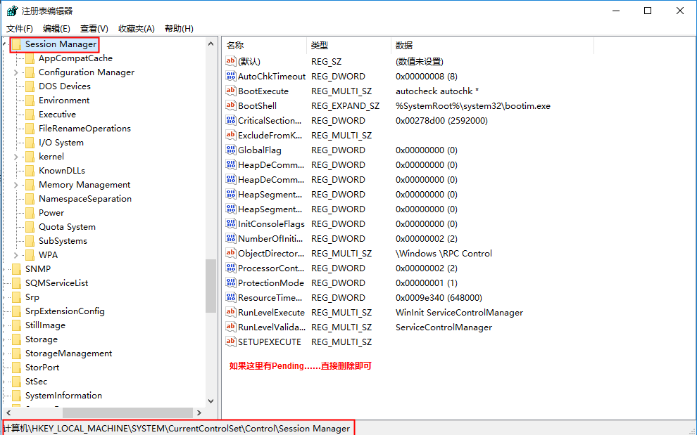 HKEY_LOCAL_MACHINE\SYSTEM\CurrentControlSet\Control\Session Manager,然后在右側(cè)框中找到PendingFileRenameOperations