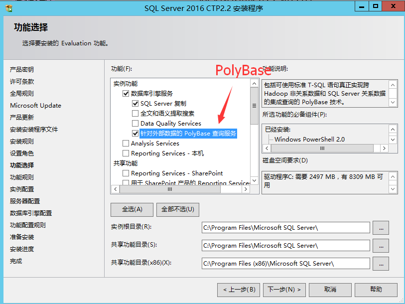安裝過程中的第一個坑來了,如果你勾選了PolyBase,它是需要安裝JAVA JRE的,因為它需要調(diào)用JRE來查詢hadoop數(shù)據(jù)