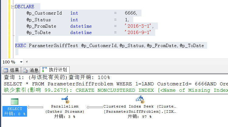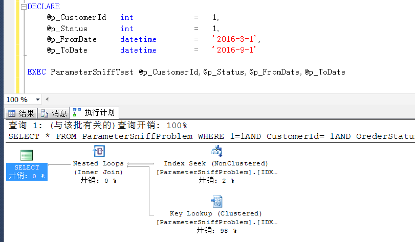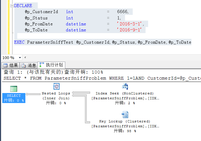 比如我查詢用戶ID=100的訂單信息,一個(gè)正常的分布的數(shù)據(jù),存儲(chǔ)過程第一次編譯,這個(gè)執(zhí)行計(jì)劃完全沒有問題,
