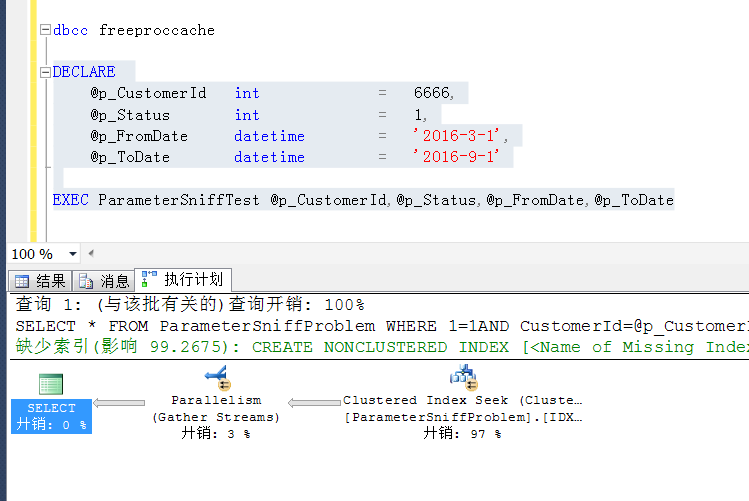 帶入@p_CustomerId=6666的時(shí)候,重編譯,執(zhí)行計(jì)劃是全表掃描,避免重用上面生成的執(zhí)行計(jì)劃,造成不合理的執(zhí)行方式對(duì)效率以及數(shù)據(jù)庫(kù)服務(wù)器資源的消耗