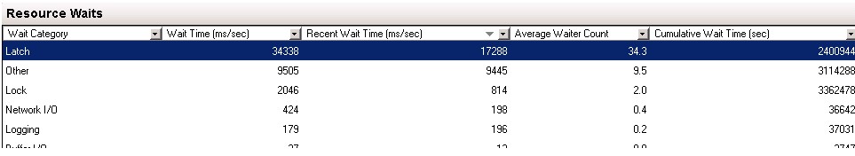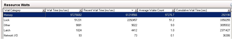 早上接到一用戶反饋其RDS實(shí)例非常的慢,通過(guò)觀察sqlserver活動(dòng)會(huì)話監(jiān)視器(active monitor)的waiting tasks(類似于mysql的thread running)可以看到有10多w的等待任務(wù),可以明確數(shù)據(jù)庫(kù)現(xiàn)在已經(jīng)出現(xiàn)了較大的瓶頸,緊接著通過(guò)resource waits看到數(shù)據(jù)庫(kù)中有大量的memory內(nèi)存等待: