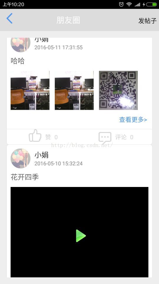 本文實(shí)例分享了一個(gè)簡單的朋友圈程序,包含了朋友圈的列表實(shí)現(xiàn),視頻的錄制、預(yù)覽與上傳,圖片可選擇拍照,供大家參考,具體內(nèi)容如下