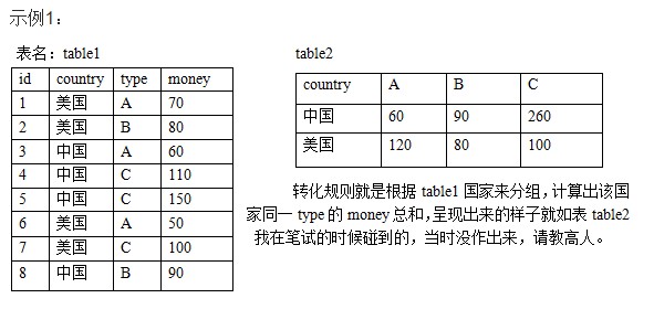 select country, sum(case when type='A' then money end) as A, sum(case when type='B' then money end) as B, sum(case when type='C' then money end) as C from table1 group by country