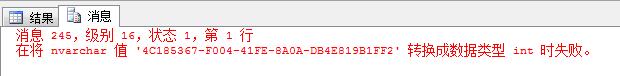 一開始拉取的數(shù)據(jù)并未有GUID的值,都是INT類型轉(zhuǎn)換過來的數(shù)據(jù),所以SQL腳本運(yùn)行的正常,但是突然某一次運(yùn)行時(shí),出現(xiàn)了“在將 nvarchar 值 '4C185367-F004-41FE-8A0A-DB4E819B1FF2' 轉(zhuǎn)換成數(shù)據(jù)類型 int 時(shí)失敗?!钡腻e(cuò)誤。如下圖所示:
