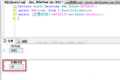 Declare @dddd Datetime Set @dddd=GETDATE() select MAX(num) from T_BasicInformation select [花費時間]=DATEDIFF(ms,@dddd,GetDate())