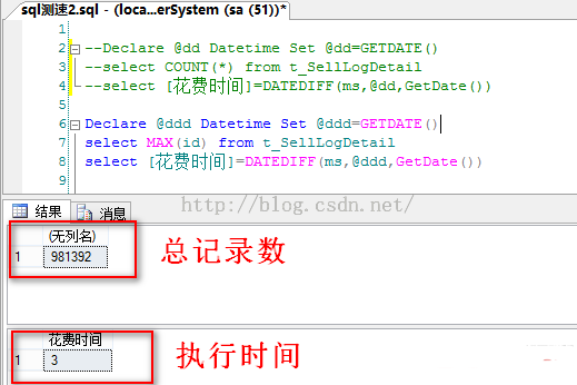 Declare @ddd Datetime Set @ddd=GETDATE() select MAX(id) from t_SellLogDetail select [花費時間]=DATEDIFF(ms,@ddd,GetDate())