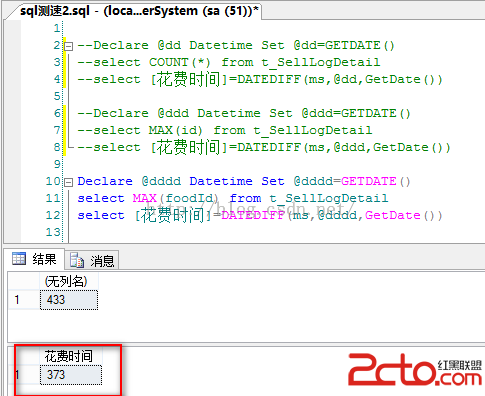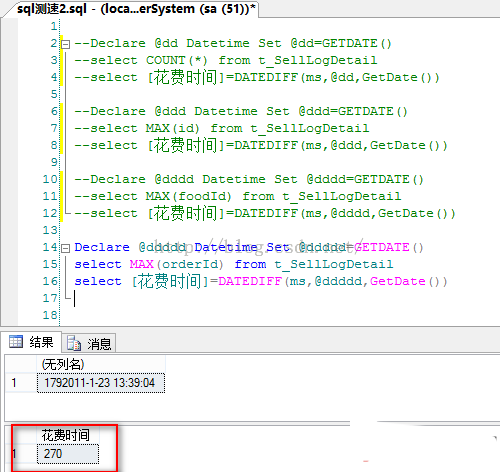 Declare @dddd Datetime Set @dddd=GETDATE() select MAX(foodId) from t_SellLogDetail select [花費時間]=DATEDIFF(ms,@dddd,GetDate())