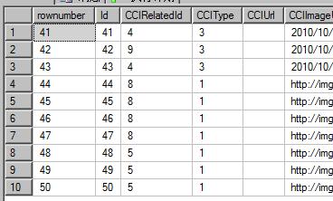 select top 10 numComImg.* from ( select row_number() over(order by id asc) as rownumber,* from (select * FROM [TCCLine].[dbo].[CLine_CommonImage]) as comImg) as numComImg where rownumber>40