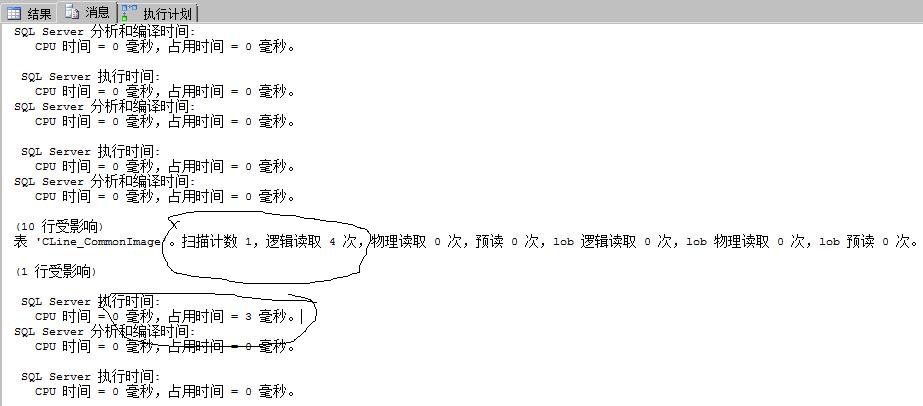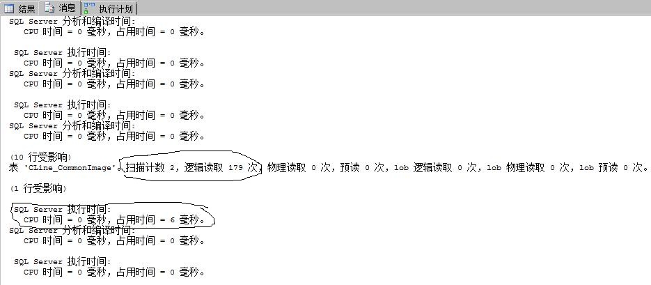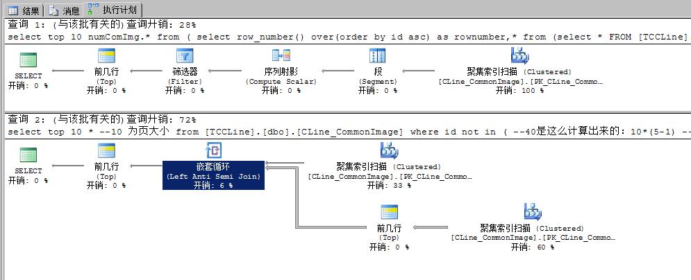 SET STATISTICS TIME ON GO select top 10 numComImg.* from ( select row_number() over(order by id asc) as rownumber,* from (select * FROM [TCCLine].[dbo].[CLine_CommonImage]) as comImg) as numComImg where rownumber>40 SET STATISTICS TIME ON GO select top 10 * --10 為頁(yè)大小 from [TCCLine].[dbo].[CLine_CommonImage] where id not in ( --40是這么計(jì)算出來(lái)的:10*(5-1) -- 頁(yè)大小*(查詢第幾頁(yè)-1) select top 40 id from [TCCLine].[dbo].[CLine_CommonImage] order by id ) order by id
