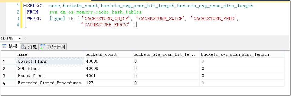 圖1中我們可以看到,其中有一步需要在緩存中找到計(jì)劃的過程。因此不難猜出,只要是這一類查找,一定跑不了散列(Hash)的數(shù)據(jù)結(jié)構(gòu)。通過sys.dm_os_memory_cache_hash_tables這個(gè)DMV可以找到有關(guān)該Hash表的一些信息,如圖2所示。這里值得注意的是,當(dāng)執(zhí)行計(jì)劃過多導(dǎo)致散列后的對(duì)象在同一個(gè)Bucket過多時(shí),則需要額外的Bucket,因此可能會(huì)導(dǎo)致查找計(jì)劃緩存效率低下。解決辦法是盡量減少在計(jì)劃緩存中的計(jì)劃個(gè)數(shù),我們會(huì)在本文后面討論到。
