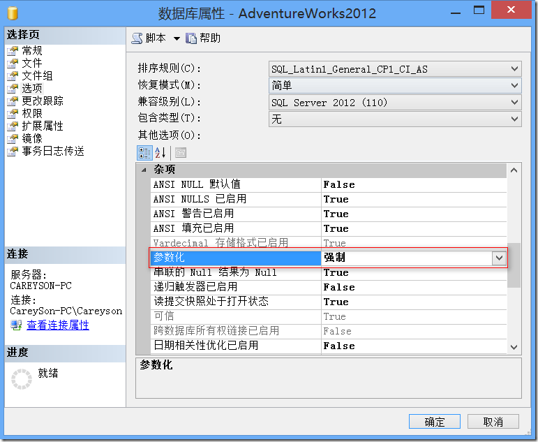 使得僅僅是某些參數(shù)不同,而查詢本身相同的語句可以復(fù)用,就是參數(shù)化的意義所在。比如說圖3中的語句,如果我們啟用了數(shù)據(jù)庫的強(qiáng)制參數(shù)化,或是使用存儲(chǔ)過程等。SQL Server會(huì)將這些語句強(qiáng)制參數(shù)話,比如說我們根據(jù)圖5修改了數(shù)據(jù)庫層級(jí)的選項(xiàng)。